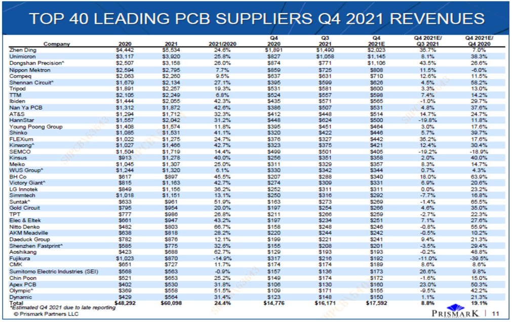 近期,国际知名电子行业咨询集团Prismark Partners发布2021年第四季度全球40强PCB企业排行榜与数据分析报告,共有七家内资企业上榜。其中,金年会科技在2021年第四季度全球PCB企业四十强排行榜中位列第22名,在内资PCB企业中位列第4名。